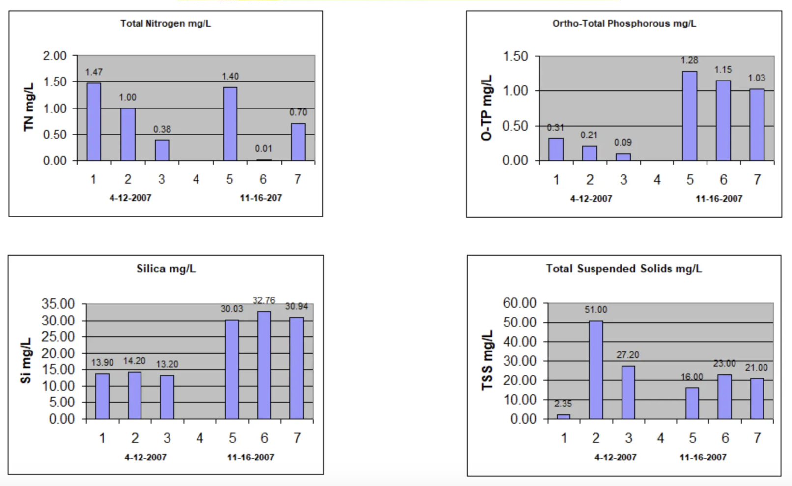 High Silica value indicates there was more freshwater present in the second sampling, and the increase in phosphorus may be due to increased groundwater influx through cracks on the bottom of the pond (fertilizers, etc.) Note: Silica increases, and salinity decreases with fresh water influx, and the reverse is true for seawater influx.