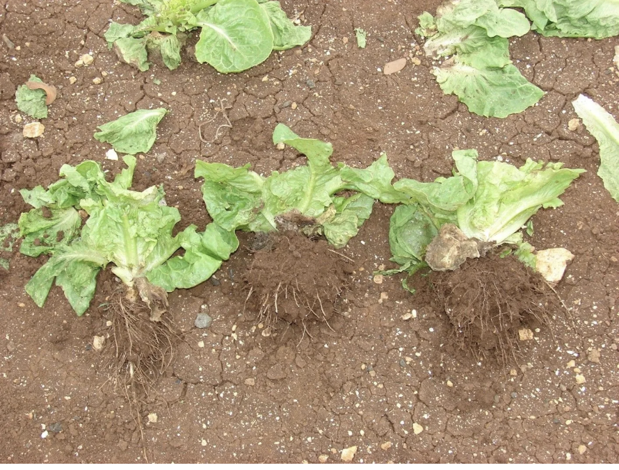 Manoa lettuce after harvest. The plant showed signs of initial Fusarium wilt damage but recovered to harvest, exhibiting nice, healthy roots.
